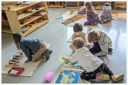 Our Primary classrooms are led by certified Montessori teachers and offer a full set of traditional Montessori child care materials for students ages three-six. The classroom environment is peaceful, yet humming with the energy of children concentrating independently, helping out younger peers, receiving one-on-one lessons from a teacher, or working in small groups. Children are free to move around the room, choosing works from any area of the classroom that speaks to their interest and ability. In between lessons, children are encouraged to prepare a healthy morning snack when they are hungry, or take time for themselves in the library corner or at the Peace Table. In our Primary rooms you can find children who take true ownership over their learning and pride in their accomplishments.